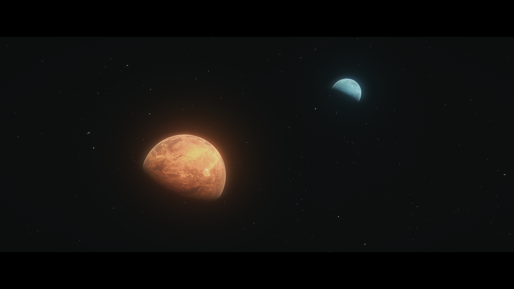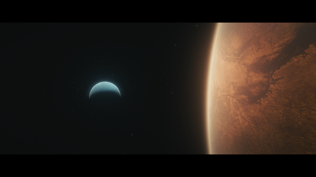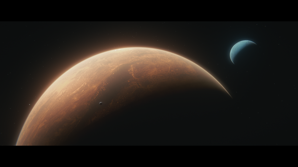 An orange desert world with a stark ice moon, orbiting around a turquoise giant. The Desert Planet HDRIs combine warm, arid tones with cooler shades of blue-green, creating striking cinematic contrasts perfect for alien landscapes and futuristic stories.