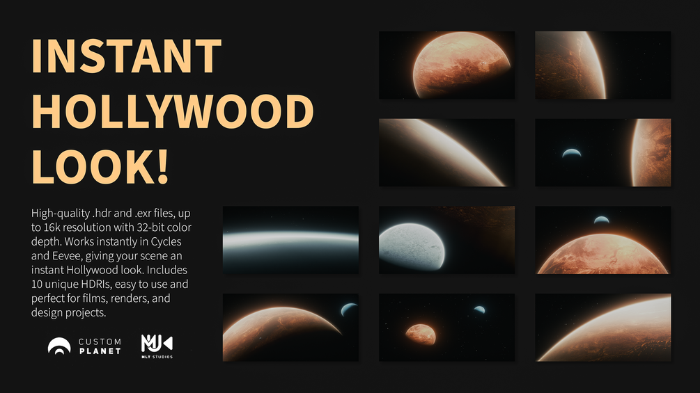 Each HDRI is designed with a cinematic, movie-like atmosphere inspired by Star Wars, Dune and all the Scifi Movies we love. In just one click, your scene gains the epic quality of a big-budget sci-fi production.